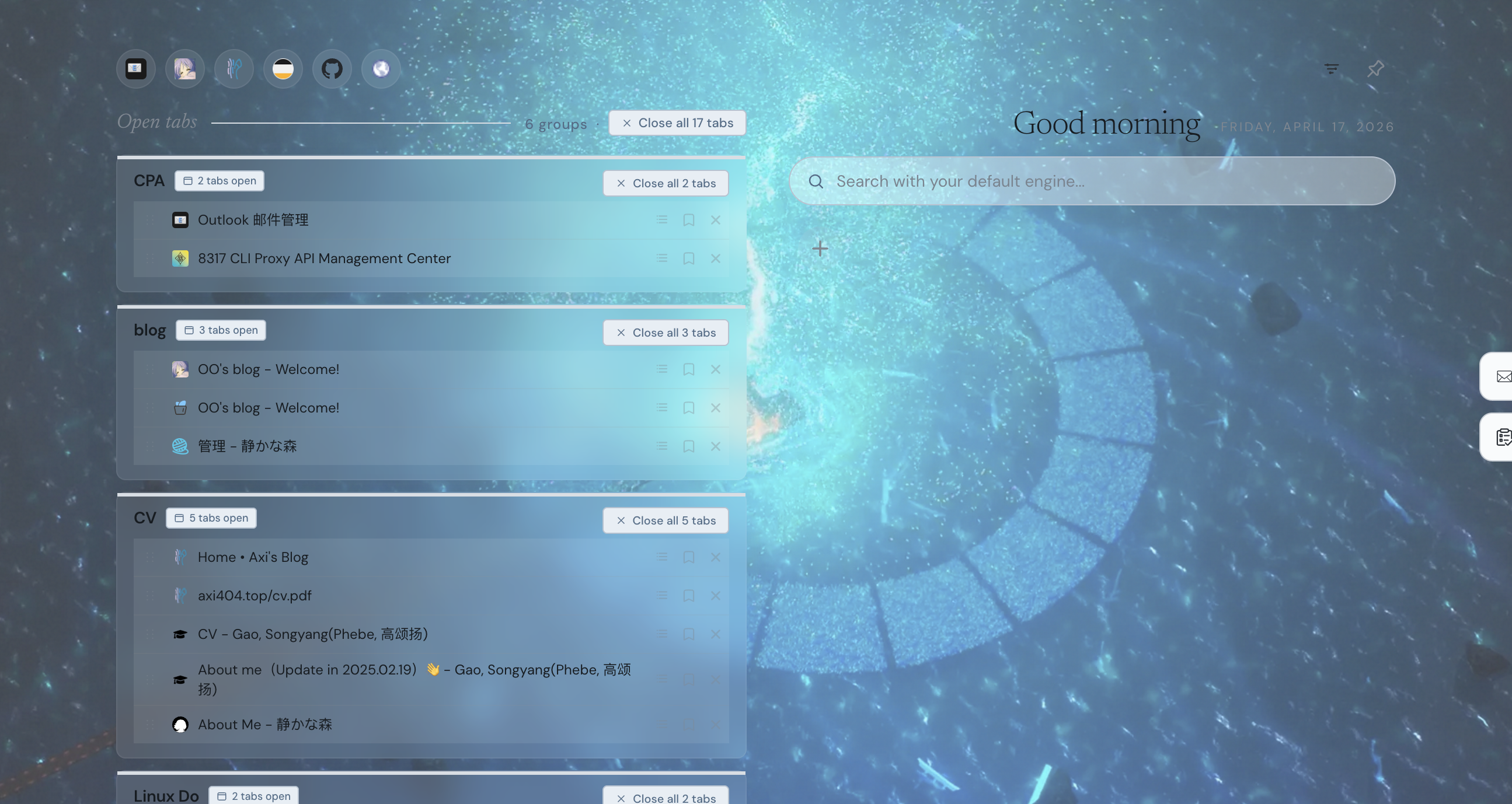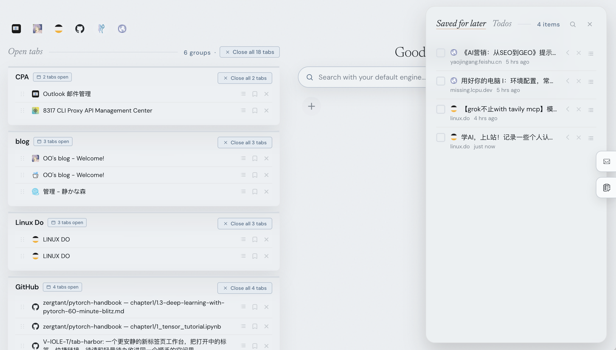 很多新标签页做得更像一个搜索框,或者一张壁纸页,偶尔再加几个快捷入口。我刚开始看着挺清爽,但一旦真的进入工作状态,标签页慢慢变多,浏览器顶部那一排东西越来越长,就感觉标签页越来越难管理。知道自己开了很多东西,但其实已经很难一眼看出来,现在到底在处理什么、哪些只是入口页、哪些是稍后要看、哪些其实已经重复了。